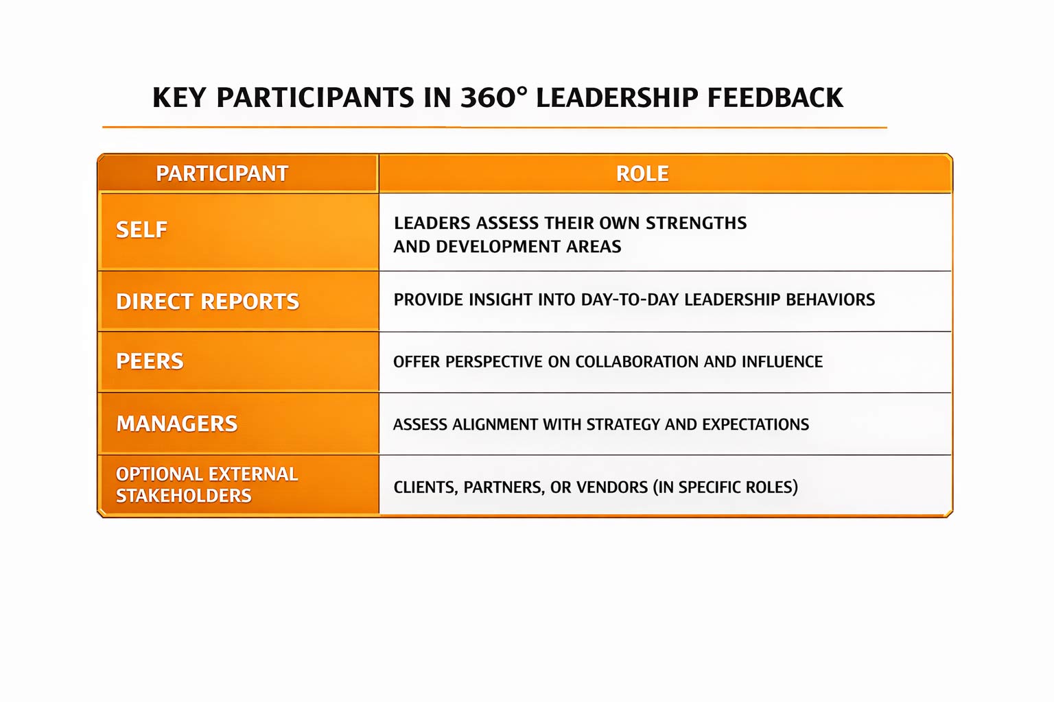360 leadership feedback is a structured leadership development process in which a leader receives feedback from multiple sources around them—not just their manager. These sources typically include: